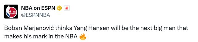 “我去年下半赛季去过中国,看过杨瀚森打球,”博班说道,“这小伙子太惊艳了——他的移动、护球、投篮,还有各种动作,比如欧洲步,都完成得非常好。他的扣篮也很精彩,几乎在场上能随心所欲。当然,中国联赛的防守水平和NBA还有差距。但关键是他还很年轻,他还有提升空间。”